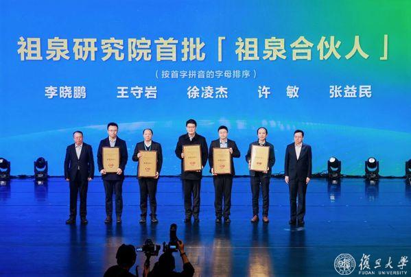 上海市教委副主任赵震与复旦大学副校长汪源源为首批“祖泉合伙人”颁发聘书