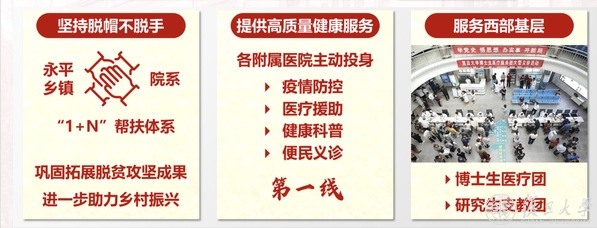 化学系、信息科学与工程学院、生命科学学院等院系组织党员深入街道社区开展科普辅导、智慧助老服务和疫苗接种宣讲;公共卫生学院师生开展中老年人数字健康服务的研究与实践;儿科医院为异地就医贫困儿童家庭打造“小布家园”,一年来已提供超4000个房晚的免费住宿……