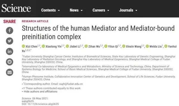 5月6日,《科学》(Science)杂志在线发表了徐彦辉课题组的研究长文(Research Article)《人源中介体复合物及其结合转录前起始复合物的结构研究》(“Structures of the human Mediator and Mediator-bound preinitiation complex”),报道了首个结构与功能完整的PIC-Mediator复合物。结构分析揭示了PIC-Mediator的动态组装过程以及Mediator调控Pol II CTD磷酸化的分子机制。该项工作与徐彦辉团队近期关于PIC的研究相呼应(https://science.sciencemag.org/content/early/2021/03/31/science.aba8490),较为全面地回答了转录起始过程的若干重要科学问题,是国内分子生物学领域的又一重大突破性成果。