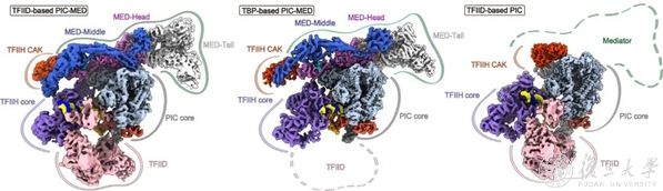 图1: 本项研究基于TFIID的完整PIC-Mediator复合物(左),中间为何源组近期发表的基于TBP的PIC-Mediator,