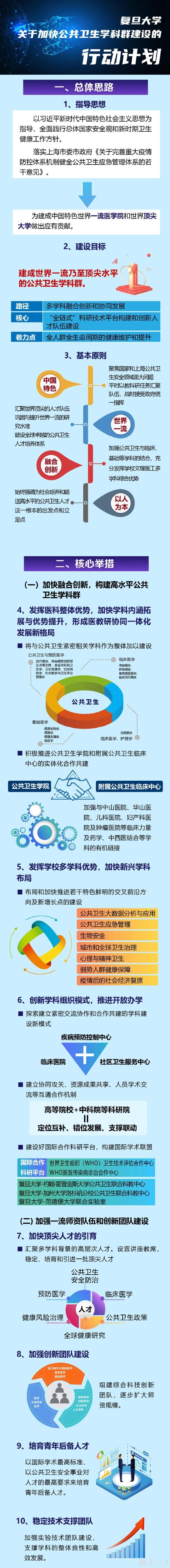 据悉,新冠肺炎疫情爆发后,复旦大学校长许宁生多次召开跨学科会议,布局公共卫生学科群建设,全面回应社会关切,呼应国家和上海市需求。“行动计划”从加快构建高水平公共卫生学科群、加强一流师资队伍和创新团队建设、构建高水平公共卫生人才培养体系、打造“全链式”多学科协作科研攻关体系、切实增强服务社会的能级等方面提出复旦大学的整体性解决方案。