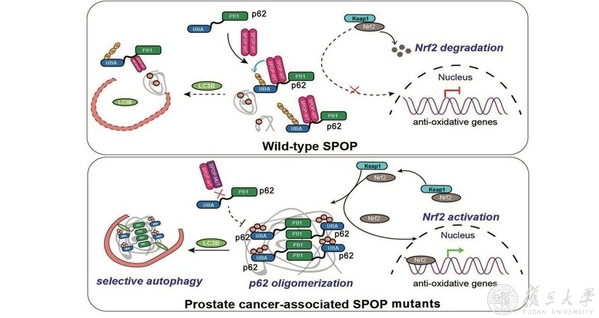 复旦大学生命科学学院王陈继副研究员和上海市第一妇婴保健院高昆研究员合作,于2022年1月6日在Cell Death & Differentiation杂志在线发表了题为“SPOP mutations promote p62/SQSTM1-dependent autophagy and Nrf2 activation in prostate cancer”的最新研究成果。该研究结果表明自噬和Nrf2激活在SPOP突变亚型前列腺癌的发生发展过程中具有重要作用,同时部分揭示了自噬和泛素-蛋白酶体系统之间的相互调控关系。
