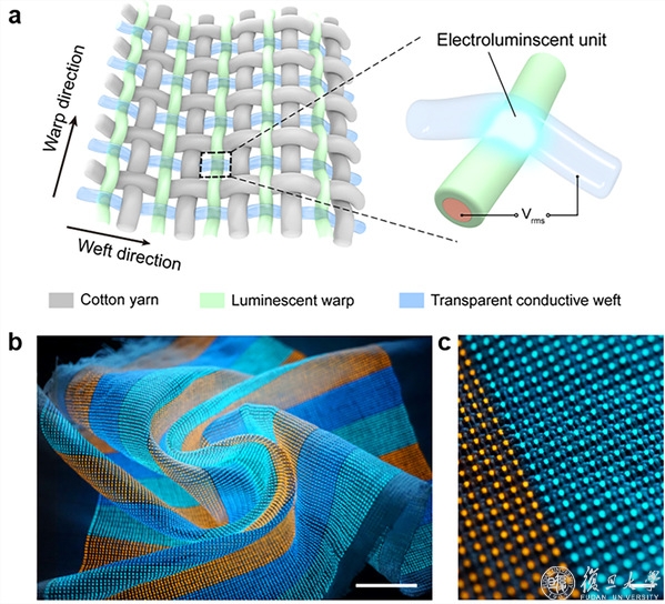 a) 显示织物结构示意图,发光经线和导电纬线在施加电压情况下,交织区域的发光材料受激发而发光;