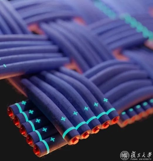 新型纤维聚合物锂离子电池成果于2021年9月发表于《自然》(Nature, 2021, 697, 57)。这项工作重点发现了纤维锂离子电池内阻与长度之间的双曲余切函数关系,有效解决了活性材料和纤维电极界面稳定性难题,连续构建出兼具高安全性和高性能的新型纤维聚合物锂离子电池。纤维聚合物锂离子电池的能量密度超过85 Wh/kg,并且具有良好的循环稳定性,循环500圈后电池的容量保持率仍然达到90.5%,库伦效率为99.8%。即使在曲率半径为1厘米的情况下,将纤维锂离子电池弯折10万次后,其容量保持率仍大于80%。进一步通过纺织方法,获得了高性能和高安全性的大面积电池织物。如果将电池织物和无线充电发射装置集成,可安全、稳定地为智能手机进行无线充电。新型纤维聚合物锂离子电池有望在智能织物、可穿戴设备、生物医疗器械等广泛领域显示重要的应用前景。