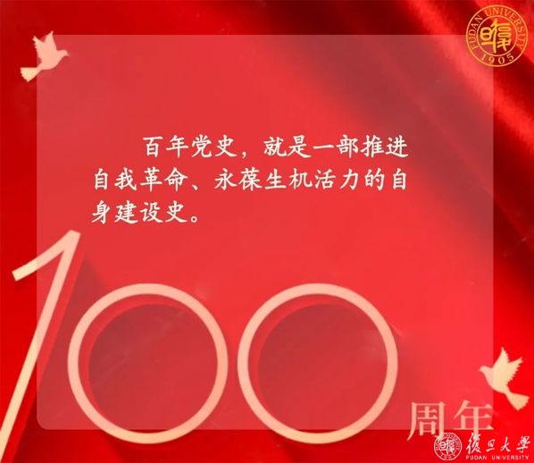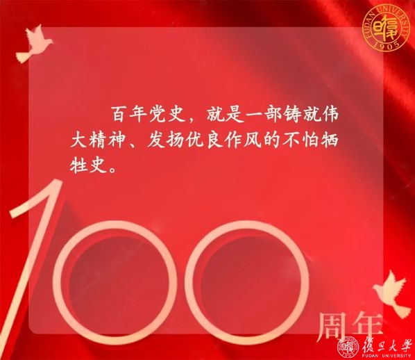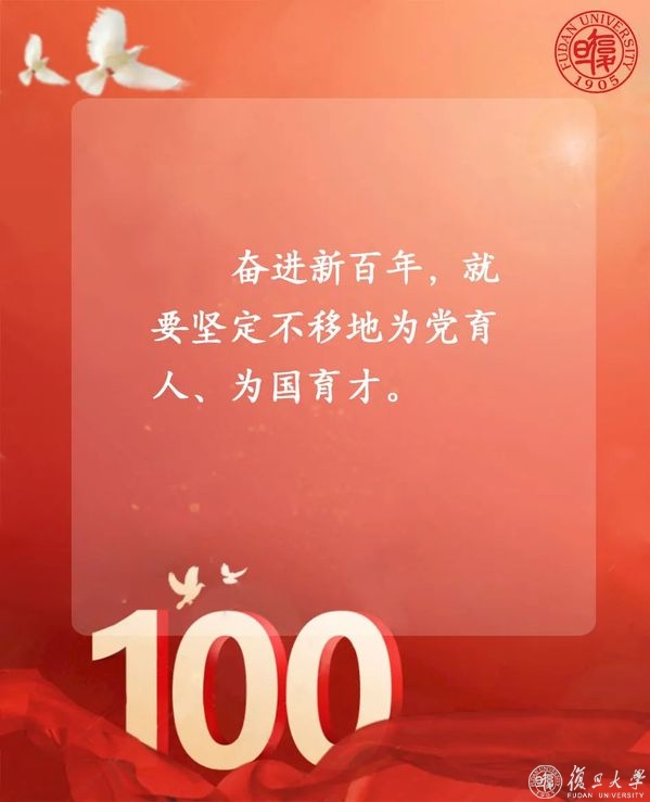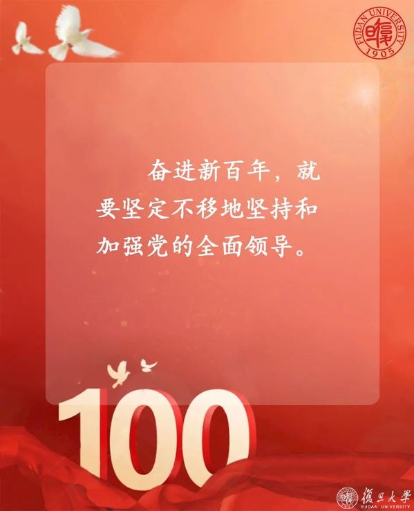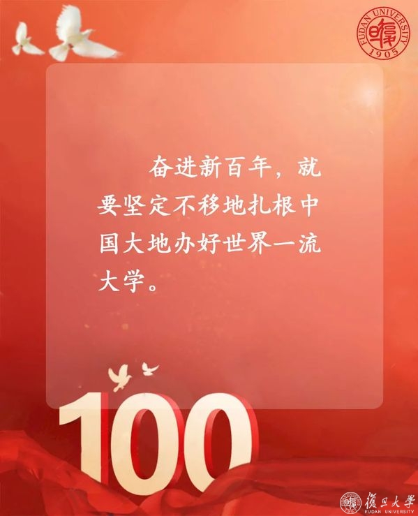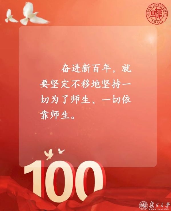 “我们不会忘记,新民主主义革命时期,复旦种下红色基因、熔铸光荣底色!社会主义建设时期,复旦迎难而上、艰苦奋斗!改革开放时期,复旦勇立潮头、走在前列!新时代的征程上,复旦勇担使命、追求卓越!”