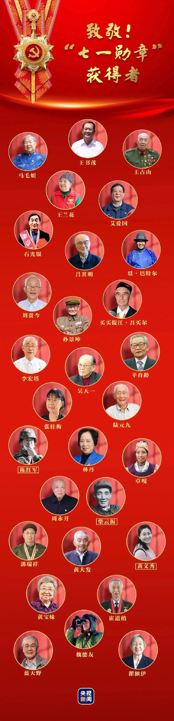 29位“七一勋章”获得者是千千万万奋战在各条战线上的共产党员的代表。正如习近平总书记所讲的“心中有信仰,脚下有力量”,共产党员要成为时代先锋,民族脊梁。作为教育工作者应理想信念坚定、对党忠诚,坚持为党育人、为国育才,教育引导青年学子立大志、明大德、成大才、担大任,在民族复兴的伟业中为党和人民建功立业。