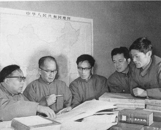 20世纪七十年代绘图的工作照,左二为谭其骧,左三为邹逸麟