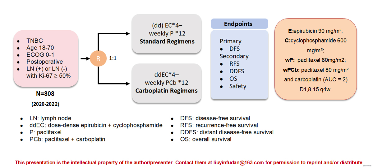 据悉,本次III期临床试验是一项研究者发起的、随机对照、开放标签的研究项目,共纳入808名此类患者,1:1分成试验组和对照组。在当前临床公认的“密集蒽环类序贯周疗紫杉醇”标准治疗方案基础上,试验组在标准治疗方案的基础上,加入卡铂药物进行强化治疗,以观察比较两组患者在生存率,复发风险以及毒副反应的差异。