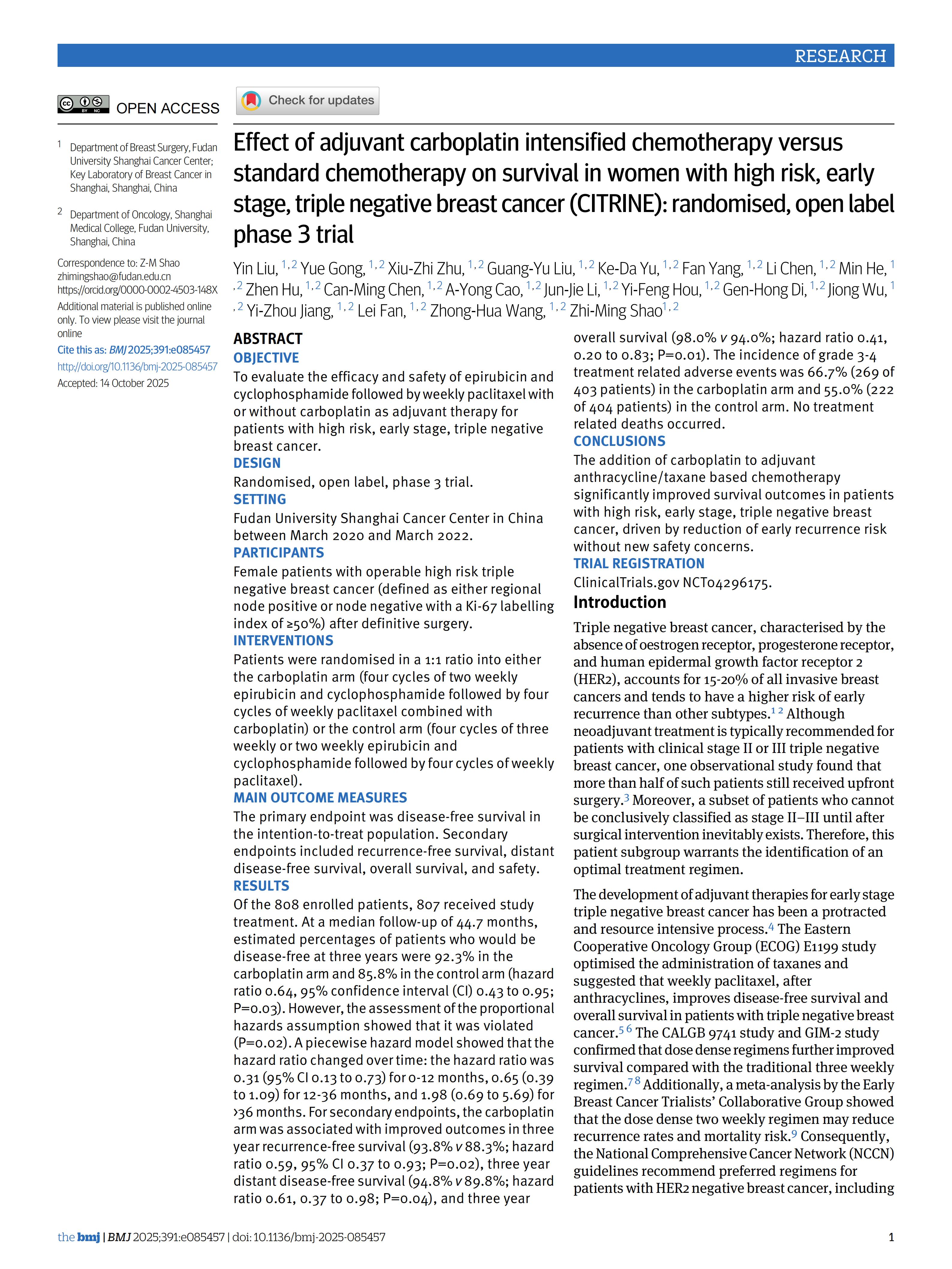 北京时间12月23日18时,国际四大医学顶刊之一《英国医学杂志》(BMJ)在线发表一项由肿瘤医院乳腺外科邵志敏教授领衔团队完成的CITRINE III期临床研究成果。该研究旨在打破最具复发风险的早期三阴性乳腺癌高危患者“千人一面”的治疗困局,临床研究发现,试验组方案在标准治疗的基础上,加入卡铂药物进行强化治疗,患者3年无病生存率达到92.3%,降低复发风险36%,显著优于对照组,为全球早期三阴性乳腺癌患者精准治疗提供了“中国方案”。