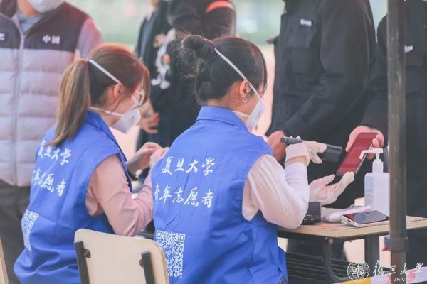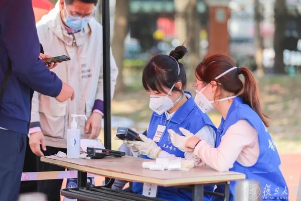 身穿印有“复旦大学青年志愿者”的蓝马甲志愿者们扫码录入信息,维持队伍秩序,通知师生进入核酸检测现场,帮助留学生、老教师等群体顺利完成核酸检测。