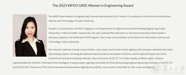 10月21日,世界工程组织联合会(World Federation of Engineering Organizations,下文简称:WFEO)官网正式官宣复旦大学信息科学与工程学院教授林燕丹获得2023年WFEO工程领域杰出女性奖。