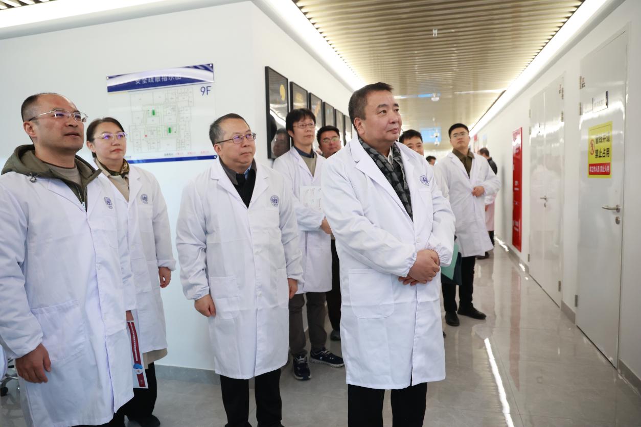 在二号科研楼实验室内,金力详细了解实验室设备运行、日常安全管理流程、实验室操作规范教育等情况,并听取关于实验室安全中心相关工作汇报。