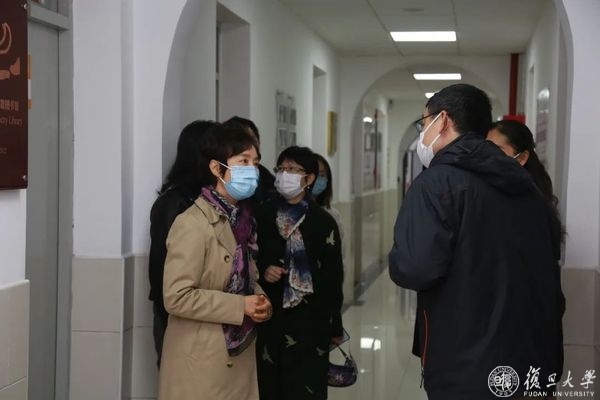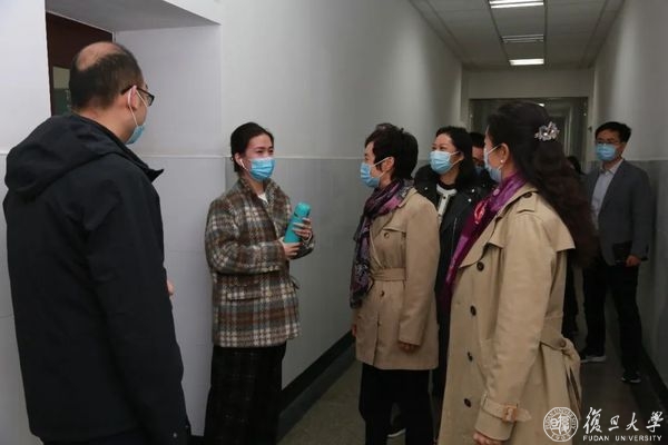 在第三教学楼,焦扬听取教学楼保障人员关于教室消杀和维护的情况汇报,并叮嘱,要提醒同学们自习期间做好疫情防护,佩戴好口罩。据了解,准封闭管理期教学楼每天进行6次消杀,采取擦拭和喷洒两种消毒方式,并遵循相关清洁消毒规范,消杀后会同步登记在《复旦大学公共区域日常清洁校区记录表》。