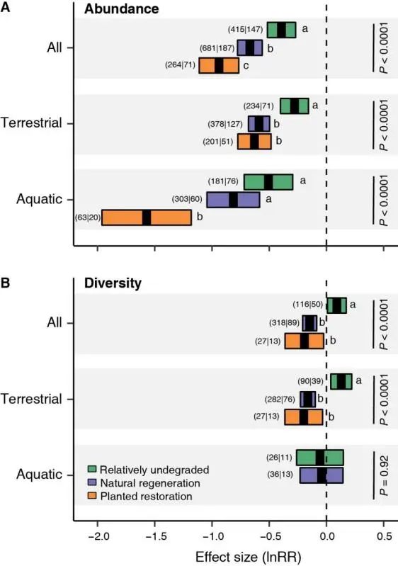 图2 自然和修复系统中植食动物对植被多度和多样性的效应量
