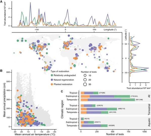 11月3日,Science以封面论文发表了复旦大学生命科学学院、生物多样性与生态工程教育部重点实验室、上海长江河口湿地生态系统国家野外科学观测研究站贺强教授团队的研究成果“Herbivory limits success of vegetation restoration globally”,通过构建和分析包含64个国家、2594组实验的全球动物消费者效应数据库(图1)和全球植物互作与恢复数据库,在全球尺度上系统研究了植食动物对植被恢复的下行效应、调控因素及管理措施。