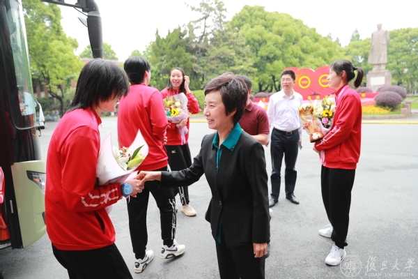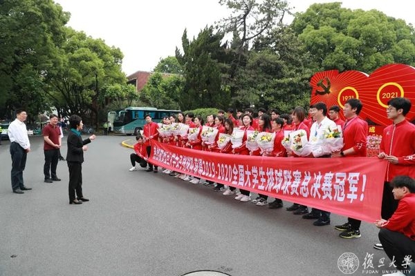 5月20日中午,复旦大学党委书记焦扬、副校长徐雷,即将出征青岛的复旦男排队以及闻讯而来的师生们,到校门口迎接夺冠凯旋的女排队伍。