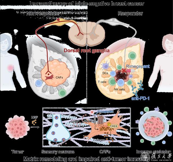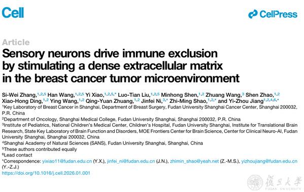 北京时间2026年2月6日凌晨,复旦大学附属肿瘤医院邵志敏教授、江一舟教授领衔团队联合复旦大学脑科学转化研究院倪金飞教授团队在《细胞》(Cell)期刊在线发表题为“Sensory neurons drive immune exclusion by stimulating a dense extracellular matrix in the breast cancer tumor microenvironment”的研究论文。