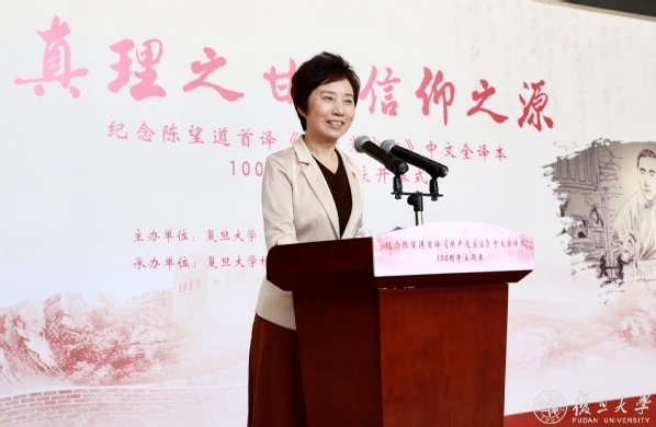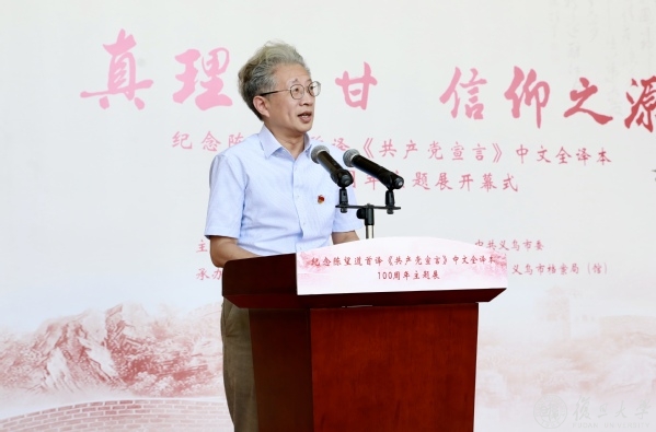 焦扬在致辞中代表复旦大学对本次巡展表示热烈祝贺,对支持展览、推进合作的浙江省和义乌市、相关单位和各界人士表示衷心感谢。追望大道,是为赓续基因、永葆初心、行稳致远、求索不息。她指出,在新长征路上,复旦大学牢记总书记嘱托,整体设计、系统推进“红色基因铸魂育人工程”,坚守为党育人、为国育才的初心使命,本次展览是贯彻落实总书记重要回信精神、纪念《宣言》中文全译本百年、弘扬“宣言精神”的重要举措。展览来到《宣言》翻译之地,对我们不忘初心,铭记从哪里来、到哪里去、为什么出发具有特别意义。她强调,迈入新时代,复旦和义乌紧密携手,连接红色根脉、弘扬宣言精神、推进校地合作,两地联动、一体发展、共建共赢,更好滋养新时代矢志拼搏的奋斗动力,更好传播弘扬“信仰之源”的精神力量。