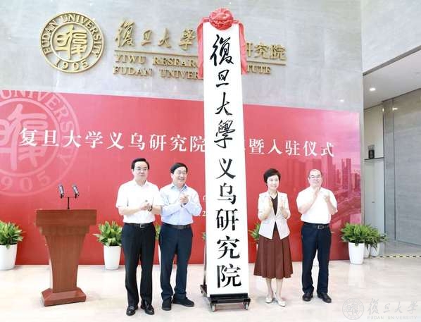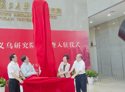 复旦大学党委书记焦扬,校长、中国科学院院士许宁生,浙江省委常委、宣传部部长朱国贤,浙江省副省长高兴夫为义乌研究院揭牌。