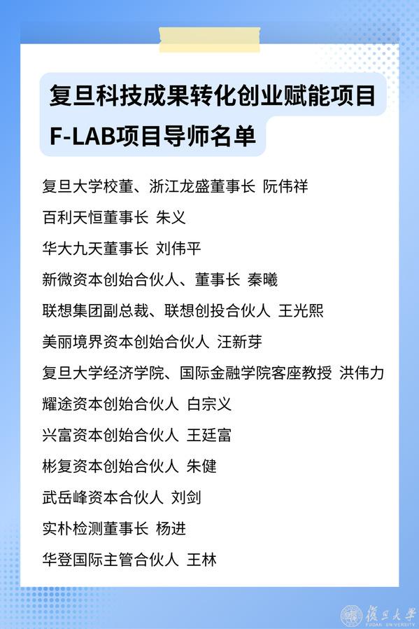 复旦科技成果转化创业赋能项目(以下简称“F-LAB项目”)启动。F-LAB项目将加强原创性、颠覆性科学研究和技术与产业应用深度融合,重点从复旦科学家与校友中发掘高潜力人才和高质量项目,通过课程赋能、陪伴辅导、要素匹配、投资孵化等“一站式”服务,培育一批由复旦科创生态全链条赋能的科技成果转化明星项目,孵化具有品牌效应和复旦标签的知名科创公司,更好助力“第一个复旦”建设。
