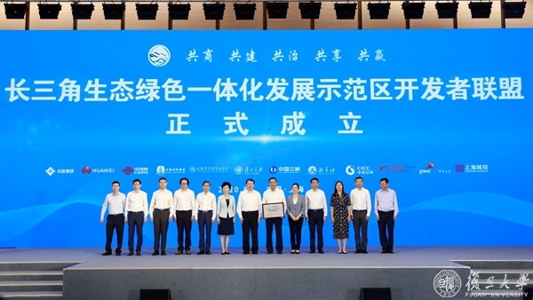 长三角浪潮渐涌,风乍起正当扬帆。8月25日下午,长三角生态绿色一体化发展示范区开发者联盟成立大会暨第一次联盟创始成员大会举行。会上,联盟创始成员单位共同签署《长三角生态绿色一体化发展示范区开发者联盟盟约》,审议并表决通过了联盟建设方案、联盟创始成员名单及秘书处人员名单。复旦大学作为12家创始成员单位之一参会并正式签订盟约。上海市政府副秘书长、市发展改革委主任、示范区理事会秘书长、执委会主任马春雷出席成立大会,为12家创始成员单位授牌并讲话。复旦大学党委书记焦扬参加会议并作交流发言。