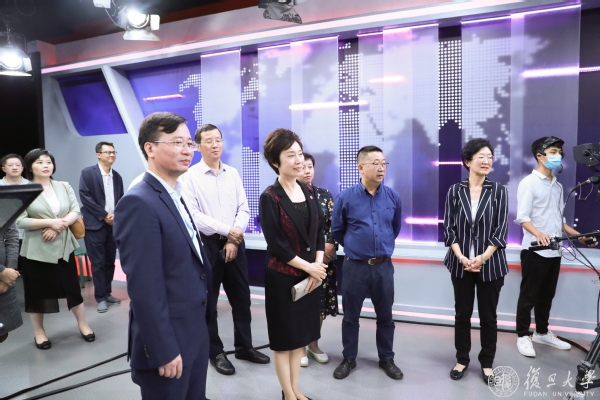 焦扬一行实地调研了云南大学新闻学院,参观了全媒体联合实验室、演播室及指挥大厅,看望慰问了云南大学新闻学院院长、复旦交流干部廖圣清,听取了学院建设情况的汇报。随后,还参观了新闻学院学生作品展,并与新闻学院师生们合影。