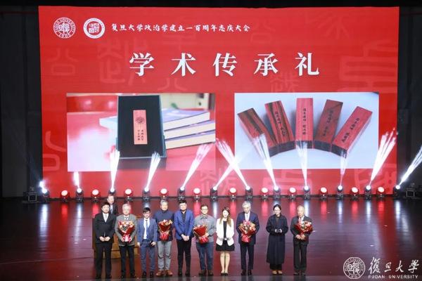 老教授代表竺乾威、桑玉成、徐以骅、臧志军、陈明明向青年教师代表授院徽学术印章,青年教师向老教授们献花、行学术传承礼。学院学生向出席仪式的13名退休教师献花致敬。