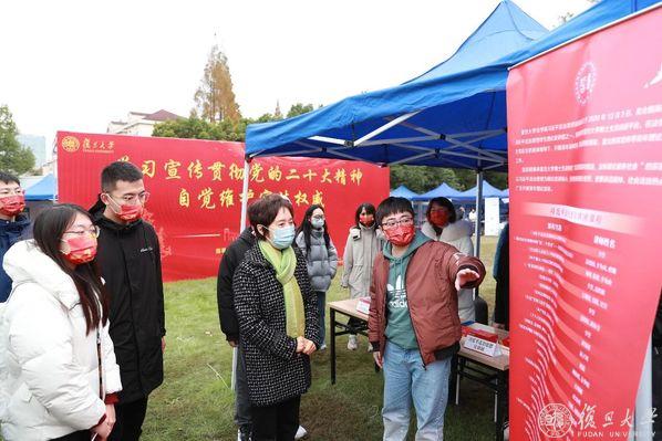 在活动摊位上,法学院法律硕士“北辰”党支部、习近平法治思想宣讲团、复旦大学学生法律援助中心、宪法学科教师党支部党员教师团队结合专业知识,针对师生需求,以宣传讲解、知识问答、文创展示、竞猜互动等方式,开展普法咨询、法律知识学习和课程放送,以习近平法治思想为核心,围绕党的创新理论、重要法治思想、重大立法举措和社会法治热点,向来参与的师生进行理论科普、宣讲。