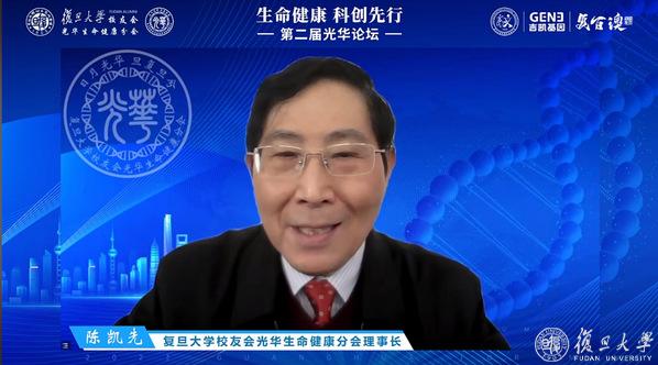 中国科学院院士、复旦大学校长、复旦大学上海医学院院长金力向本次活动的召开表示祝贺,向出席论坛的各位专家,参会的各位校友、嘉宾致以新春问候。他表示,分会成立一年以来,在推动跨学科、跨领域、跨背景的资源整合与赋能,推动生命健康领域的科技创新方面,开展了卓有成效的工作。特别是在疫情中,分会利用网络平台,积极宣传推广学校相关科研成果,密切沟通相关院系、研究所及附属医院等单位举办高质量活动,深入进行行业资源对接,成为产、学、医、研融合互动的大平台,为提升母校在生命健康领域的影响力贡献行业校友会的重要力量。他期望光华论坛越办越好,成为校友促进母校学科交叉融合、科创文化培育的一大示范项目。他希望分会进一步涵育校友文化,光大复旦精神;进一步促进校友交流,增强广大会员的获得感;进一步汇聚校友与校友之友的资源,助力母校在全面建设社会主义现代化国家的壮丽史诗中续写新辉煌。