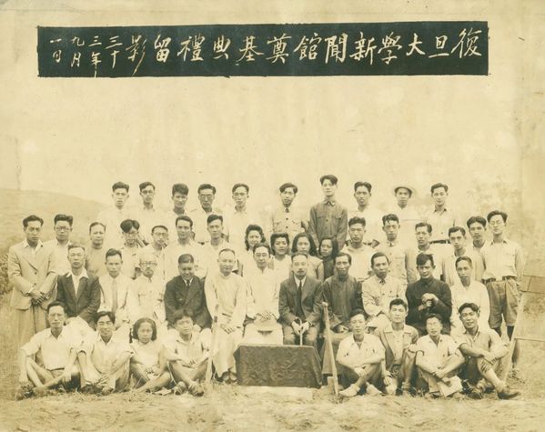 1944年9月1日,陈望道(二排右四)参加复旦大学新闻馆奠基典礼