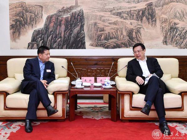 新华社社长、党组书记傅华在新华社新闻大厦会见复旦大学党委书记裘新。新华社 秦灿 摄