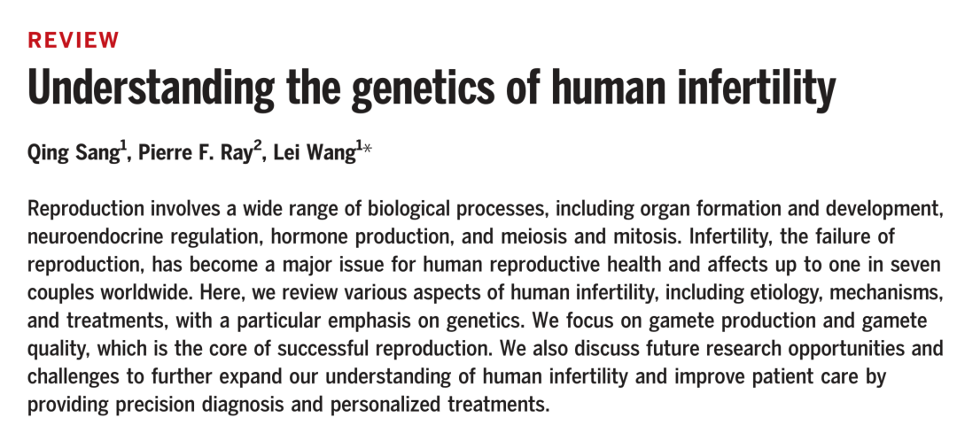 复旦大学生物医学研究院桑庆、王磊分别为综述论文的第一作者及通讯作者,法国格勒诺布尔-阿尔卑斯大学(Université Grenoble Alpes)的Pierre Ray教授参与了精子遗传学研究进展部分的撰写。