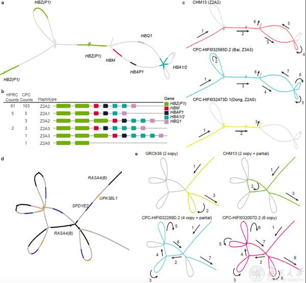 CPC泛基因组图谱作为首个中国人群专属的泛基因组参考图谱,与HPRC泛基因组图谱相比,在中国人群特有的复杂变异解析方面具有显著优势。CPC泛基因组图谱中新发现了1079个基因拷贝数变异,以及包含药物代谢基因CYP2D6等在内的在中国人群中富集而在其他世界人群中出现频率较低的若干基因拷贝数变异;新鉴定出富集在中心粒、端粒等染色体复杂区域的3.4万个结构变异,其中半数以上仅在单个或两个样本中出现——若不针对中国丰富的族群多样性开展专门研究,将没有机会发现这些遗传变异。研究人员进一步揭示,这些CPC新发现的遗传变异可能与亚洲人群特有的疾病易感性及表型多样性有关。一个典型的例子是α-珠蛋白基因簇,研究人员在该基因区域鉴定出两个中国人群特异性的大规模结构变异,包括一段20kb的缺失序列和一段10kb的重复序列,这将为进一步研究中国人群贫血症的遗传机理和致病机制提供新的线索。