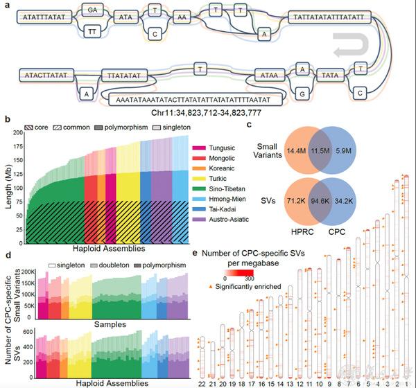 在其第一期研究计划中,CPC对代表中国36个族群的58个样本采用最新的第三代高保真基因组测序技术进行了深度测序,结合最新的单倍型基因组组装方法,获取了116个高质量单倍型基因组,并以图基因组的方式构建了高质量中国人群参考泛基因组。该泛基因组图谱总共包含约3.01 Gb个碱基对的序列信息,在现有人类参考基因组的基础上新增了约1.9亿个碱基对的新序列,包含约590万个小变异(单核苷酸多态性变异和小规模插入/缺失变异)和约3.4万个结构变异(Structural variation, SV),涉及至少1367个蛋白编码基因复制事件等。其中,约500万个碱基对新序列存在于95%以上的单倍型中,被视为中国人群基因组核心序列,可能与中国人群特有的较为稳定的生物学功能或表型特征相关。