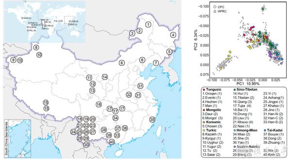 CPC一期核心样本地理分布及语系、族群、遗传聚类关系