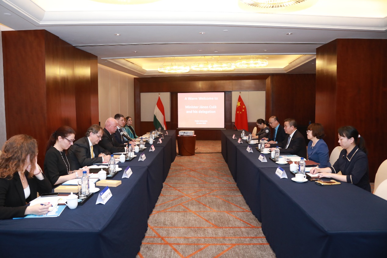 6月16日,率团访华的匈牙利文化创新部部长查克·亚诺什(CSÁK János)到访复旦大学,校长金力会见代表团一行。