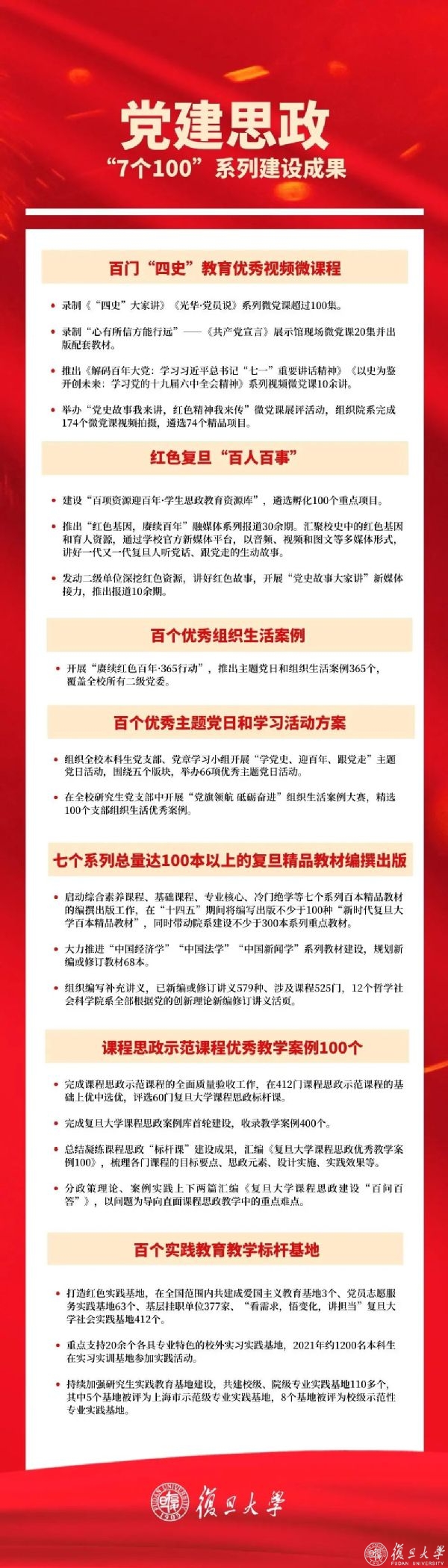 梳理各门课程的目标要点、思政元素、设计实施、实践效果,汇编《复旦大学课程思政优秀教学案例100》;以问题为导向直面课程思政教学中的重点难点,汇编《复旦大学课程思政建设“百问百答”》,以问题为导向直面课程思政教学中的重点难点;制定《课程思政建设工作细则》,成立课程思政教学研究中心,全覆盖开展教师课程思政培训,加强课程思政教育教学改革研究……2021年,复旦大学以精益求精的态度推动课程思政建设提质增效。