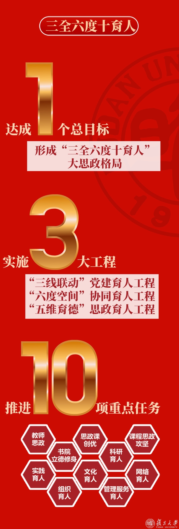 在教育部“三全育人”综合改革试点布局中,上海是首批试点地区,复旦大学、同济大学是首批试点高校。目前,上海的试点工作已形成4大特点:一是建立市级层面的统筹协调机制,由市委副书记担任市委高校思政工作领导小组组长,相关常委同志和分管副市长担任副组长,20多个委办局参加。二是形成“三圈三全十育人”圈层育人格局,内圈聚焦第一课堂育人主渠道,中圈聚焦素质教育第二课堂,外圈聚焦整合社会资源,服务高校育人,通过实施开门办思政,构建全社会关心支持“三全育人”的大格局。三是探索大中小学思政课一体化路径,依托高校及其附属中小学率先试点,按照规定设计大中小学思政课内容,促使大中小思政课程和教学分层递进、螺旋上升、整体衔接。上海的实践表明,加强思政理论课程教学是推动习近平新时代中国特色社会主义思想三进的主要渠道,需要坚持改革创新,与时俱进,持续提高课堂育人实效。四是做强高校课程思政和中小学学科德育。我们将在教育部的支持指导下,进一步加强探索创新,统筹各领域各环节各方面的育人资源和育人力量,推动知识传授、能力培养与理想信念、价值理念、道德观念的教育有机结合,整体构建三圈实体。