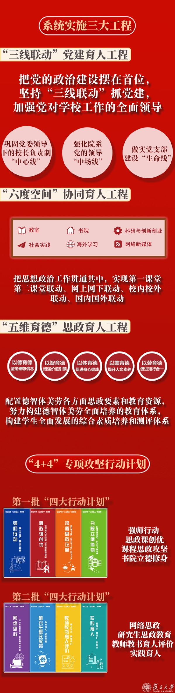 一是坚持价值导向,落实三线联动,传承红色基因,用好抗疫课堂,突出党建引领。二是坚持问题导向,2019年重点推进思政课创优、课程思政攻坚、书院立德修身、全面强师4大行动计划,2020年又压茬推进研究生思政、实践育人、网络育人和评价体系4大行动计划,破解关键难题。三是坚持改革导向,构建“思政课程+课程思政”的一体化课程体系、“学生+教师”的一体化实践体系、“育人+科研+社会服务”一体化评价体系等,突出系统集成。四是坚持基层导向,重视发挥教师育德育人主体作用、学生立德成才主体作用、机关院系办学主体作用。
