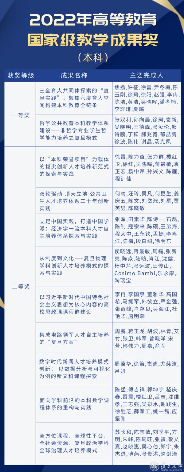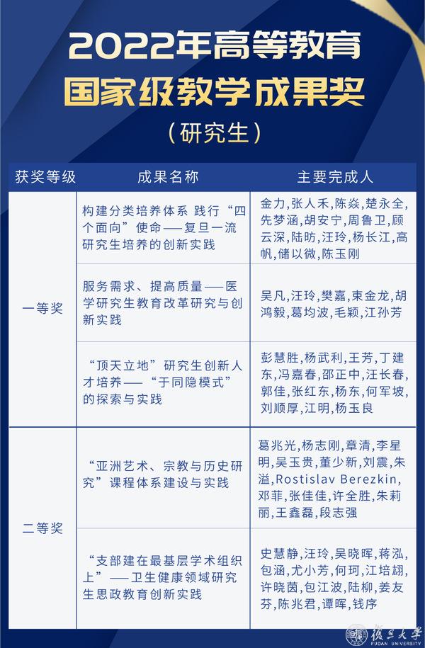 其中,复旦大学获得2022年高等教育(本科)国家级教学成果奖一等奖2项、二等奖9项;2022年高等教育(研究生)国家级教学奖一等奖3项、二等奖2项。(按第一完成单位计算)