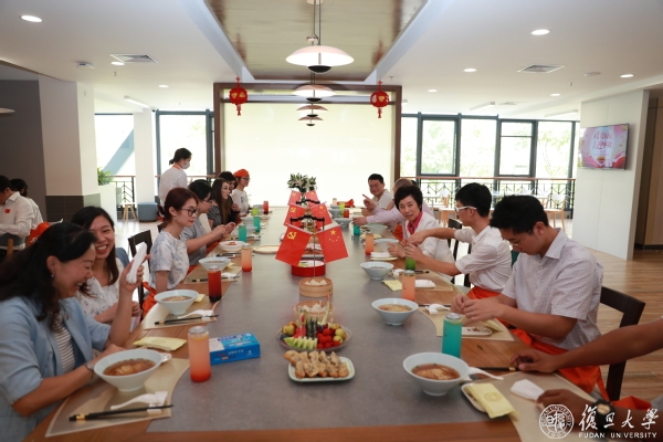 午餐时分,焦扬一行在食堂二楼与师生代表一起吃国庆面。