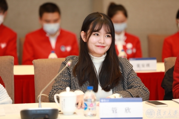 卢鹤分享了今年在疫情防控状态下的志愿服务感受。她说,复旦同学带着能够参与国家大事的光荣感与使命感,在各自的岗位上做好服务工作,在进博会会场上践行着“团结、服务、牺牲”的复旦精神,用实际行动将回信精神中的殷切嘱托落到实处。
