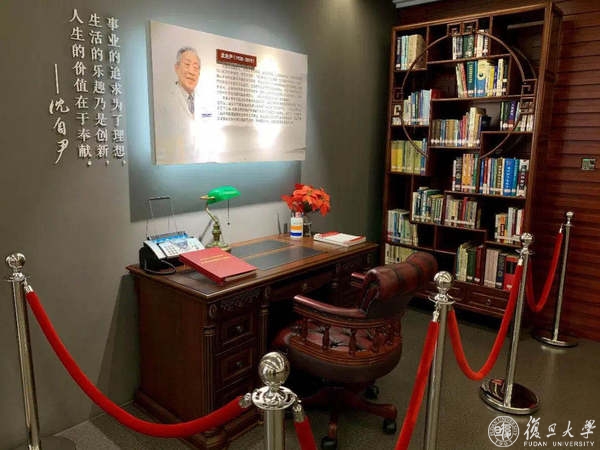 来到复旦大学图书馆医科馆6楼西南侧,走进展厅,首先映入眼帘的是一张书桌和座椅,桌上有传真机、老式台灯、笔筒、装饰盆花……大部分均为沈自尹院士生前所用旧物,除了一本特殊的新名册。