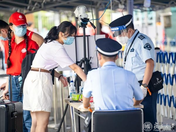 一早,来自五湖四海的复旦新生、家长们已经在邯郸校区正门口合影留念。新生有序排队扫码、查验防疫信息。入校流程方便、快捷。