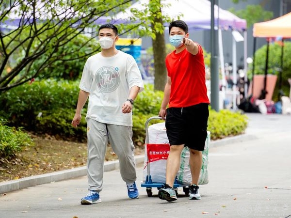 为方便新生快速进校,减少人员聚集,保卫处增设“新生报到专用通道”,并加长通道纵深。安保队员有条不紊地测温、查证(扫码),最大限度实现人员快速通行。此外,保卫处专门在本部、北区、东区和南区设置四个缓冲区,专设指引牌,经测温、查证后,引导送新生入校的车辆在指定区域卸运行李,再指引新生前往报到点。在各主要新生报到通道和车辆缓冲区设置行李临时放置点,安保队员协助志愿者帮助新生卸运和转运行李。