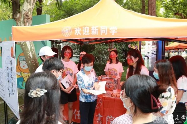 校园内,五大书院的五色风车和彩旗迎风招展,印有学生设计的老校长卡通形象的道旗讲述着“希与卿度,任志腾飞”的百年故事。焦扬一行来到任重书院中庭,橙色的背景板和可爱的书院萌宠映入眼帘,任重书院院长、复旦大学中文系教授陈尚君正和报到咨询台的志愿者一起迎新生。陈尚君每年都来迎接新生,与新生交流、合影,今年也不例外。